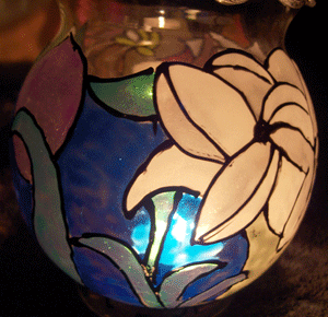 My affordable version of stained glass. This is actually a fish bowl that I applied simulation stained glass to. I made a few of these, and dropped candles in them for my garden sitting area. |